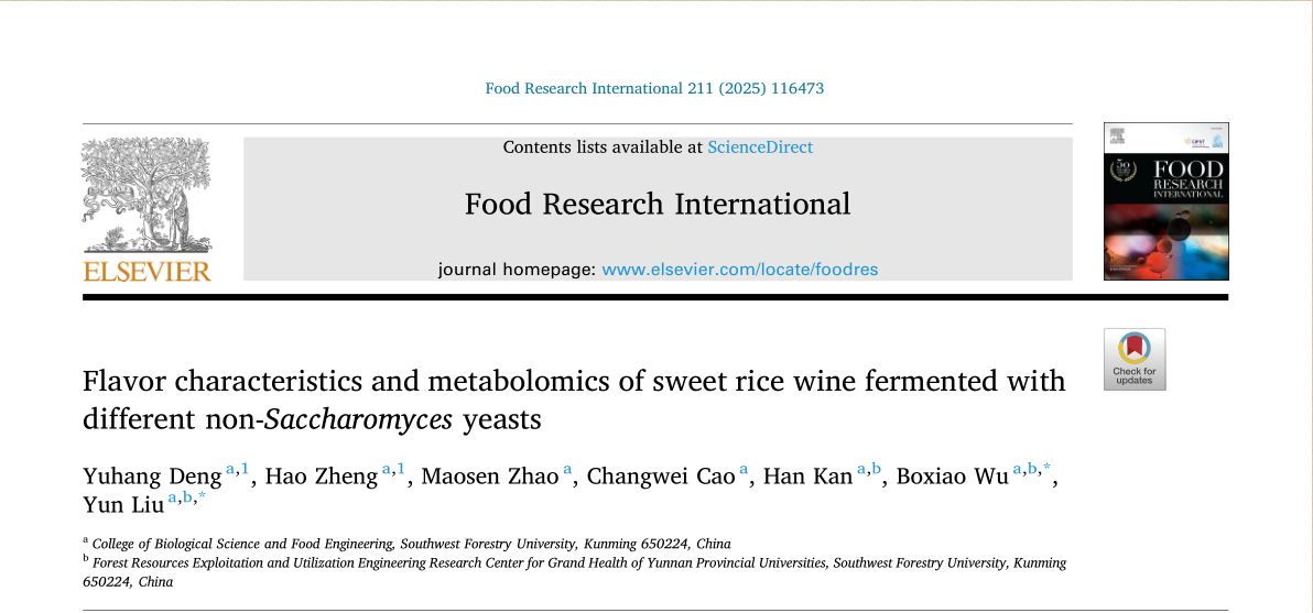 近期,西南林业老员工物与食品工程公司森林资源功能化学与健康食品创新团队以甜米酒为原料,研究非酿酒酵母对产品风味的改善领域取得新研究进展。相关成果以“Flavor characteristics and metabolomics of sweet rice wine fermented with different non-Saccharomyces yeasts”为题发表在农林科学类中科院一区TOP期刊《Food Research International》(IF=8.0)上。2026世界杯指定网站食品加工与安全专业2022级硕士研究生邓玉...