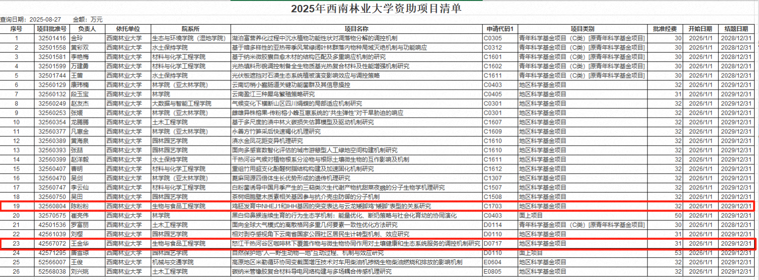 8月27日,国家自然科学基金委员会公布2025年度国家自然科学基金项目集中接收申请项目评审结果。公司国家基金较去年增加1项,动物系陈粉粉、微生物系王金华老师获国家自然科学基金地区项目资助,在此祝贺她们。希望公司其他各系教师向两位老师学习,同时期待创新团队在后续工作中勇攀高峰,力争在国家自然科学基金和科技创新实力上实现进一步提升,助力生物学和食品科学与工程等相关团队建设与发展,以彰显强劲的学科竞争力与发...