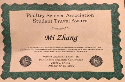 硕士研究生张咪作了题为“Dietary Fiber Modulates Gut Microbiota to Mitigate Antibiotic Resistance Gene Dissemination in Broiler Chickens”的学术报告。报告聚焦细菌耐药性问题,提出在肉鸡日粮中添加膳食纤维—菊粉,能够调节肠道微生物结构、抑制潜在致病菌,从而降低体内耐药基因的传播。该研究成果为减轻家禽生产中抗生素耐药基因的传播提供了有效的营养策略。基于其研究特色和成效,张咪同学荣获家禽科学协会研究生奖学金。